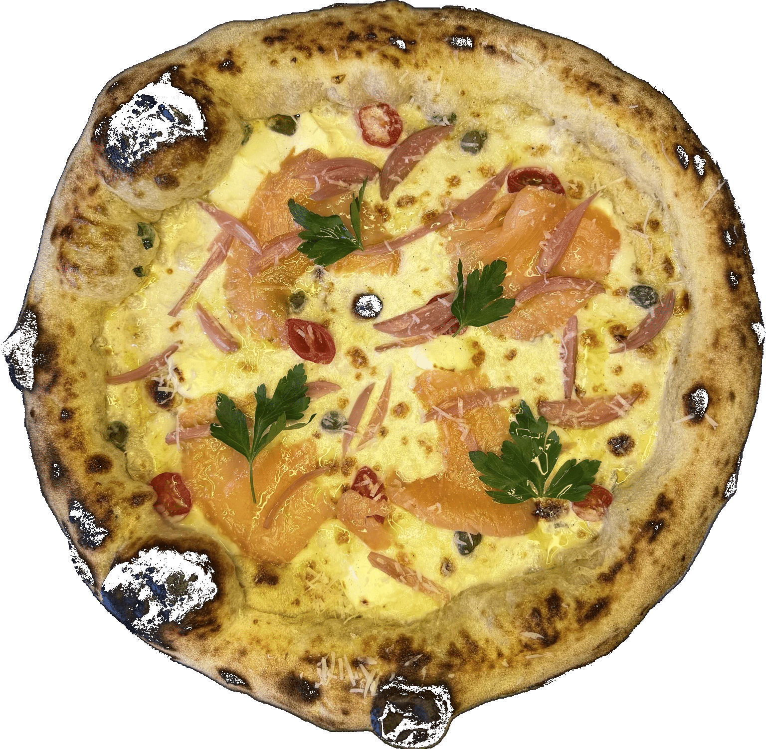 Krém z mascarpone, mozzarella FDL, kúsky udeného lososa, cappari, nakladaná kyslá šalotka, cherry paradajky, peccorino romano, olivový olej